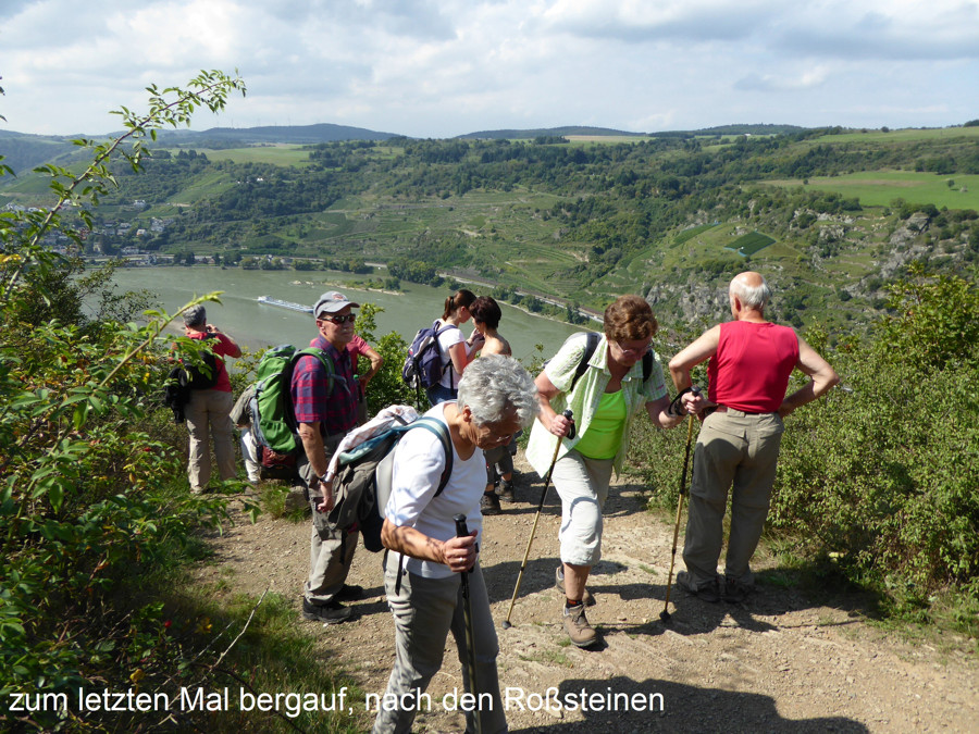dem Rheinsteig bezeichnet. Die lange und abwechslungsreiche Wanderung haben die Wanderer der Wanderfreunde Nilkheim durch einen Start ab der Loreley etwas abgekürzt und waren somit nur 17 km unterwegs. Der Start war um 6.40 Uhr am Hauptbahnhof in Aschaffenburg. Die Fahrt am Rhein entlang war durch Nebelbänke etwas beeinträchtigt. In St. Goarshausen wartete ein Taxi, das die 12 Wanderer in zwei Fahrten bis zum Loreley-Plateau brachte. Wir wollten nach der Taxifahrt einen Stichweg zur Loreley gehen, zweigten jedoch zu früh ab und verzichteten dann auf den Besuch am Loreleyfelsen, weil der Nebel im Rheintal keine Aussicht geboten hätte. Trotz der Nebelschwaden im Rheintal hatten wir einen ausgeprägten Sonnenschein, der den gesamten Tag anhielt. Der Weg führte durch offenes Gelände und die Waldabschnitte waren wegen der angenehmen Kühle bald willkommen. Der Bornichbach, zu dem wir hinunterstiegen und dann ein Holzbrücklein überquerten verlangte einen ersten, kurzen Anstieg. Nach einer Rast an einem Aussichtsplatz, kam bald der nächste Abstieg in das Urbachtal. Auf einem schmalen Pfad, teilweise mit Stufen, ging es steil bergab. Nach dem Queren des Baches folgte ein langgezogener Aufstieg zum nächsten Pavillon. Über das Urbachtal hinweg konnten wir unseren ersten Rastplatz mit dem Pavillon erkennen. Die nächsten Aussichten boten uns Blicke auf Oberwesel mit seinen Kirchen, der Schönburg und der Stadtmauer am gegenüber liegenden Rheinufer an. Der Blick auf Oberwesel begleitete uns bis zu dem Felsensporn bei den Roßsteinen. Nach einer weiteren Aussichtsrast ging es auf einem Pfad steil und im Felsgelände bergauf, wobei Drahtseilsicherungen eine Hilfe boten. Auf der Hahnenplatte mit einem weiteren Pavillon konnten wir in der Ferne unser Ziel bei der bekannten Zollburg Pfalzgrafenstein bei Kaub erkennen. Bis dahin führte uns der Weg durch eine Hügellandschaft mit Freiflächen und Wald nach Dörscheid. Bis zu unserem Ziel in Kaub ging es nun ca. 300 Höhenmeter , entlang ehemaliger Weinbergsterassen, bergab. Die nächsten Aussichten boten uns Blicke ins Rheintal mit der Zollburg Pfalzgrafenstein mitten im Fluß und der Burg Gutenfels über der Ortschaft Kaub. Nach dem Abstieg durch Weinhänge und Treppen folgte ein Weg durch das langgezogene Kaub bis zur Einkehr gegenüber des Bahnhofes. Durch die Nähe zum Bahnhof konnten wir diese Schlussrast bis zur letzten Minute genießen, bevor uns der Zug wieder in Richtung Aschaffenburg brachte.